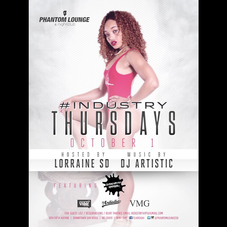 Come peep out San Diego’s hottest Thursday night happening; “Industry Thursdays” the lovely sexy host Miss Lorraine and the world famous DJ Artistic. Every Thursday night Lorraine and DJ Artistic invite their music, fashion, nightlife and entertainment industry friends out to network and party. “Industry Thursdays” is a sexy cool relaxed atmosphere with affordable hookahs and bottles in Downtown San Diego. No Drama at the door, just cool people at a cool spot enjoying cool music.