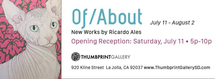 Thumbprint Gallery is pleased to present San Diego based artist Ricardo Ales in his first solo exhibition Of/About. Of/About is an exhibition drawing from ideas that surround art practiceconversations that occur everyday around artworks and between artists. Ales grew up around more cats than is probably reasonable to have in one household and that is the reason for the feline overload in the exhibition. They serve as anchors for the conceptual aspects of the work. As funny, adorable, or disturbing as they may be, the cats are a vehicle that allow for the ideas to mobilize. An opening reception is scheduled for Saturday, July 11th (510pm). Beer and sangria will be available. Ricardo Ales will be present.